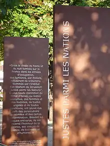 La première stèle reproduit le texte inscrit sur la plaque en hommage aux « Justes de France », installée dans la crypte du Panthéon à Paris en : « Sous la chape de haine et de nuit tombée sur la France dans les années d’occupation, des lumières, par milliers, refusèrent de s'éteindre. Nommés [par l’Institut Yad Vashem de Jérusalem] « Justes parmi les Nations », [la plus haute distinction de l’État d’Israël], ou restés anonymes, des femmes et des hommes, de toutes origines et de toutes conditions, ont sauvé des juifs des persécutions antisémites et des camps d’extermination. Bravant les risques encourus, ils ont incarné l’honneur de la France, ses valeurs de justice, de tolérance et d'humanité[3]. »