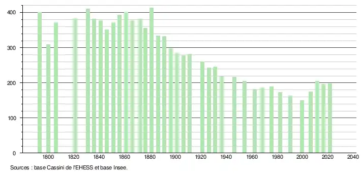 L'évolution du nombre d'habitants est connue à travers les recensements de la population effectués dans la commune depuis 1793. Pour les communes de moins de 10 000 habitants, une enquête de recensement portant sur toute la population est réalisée tous les cinq ans, les populations légales des années intermédiaires étant quant à elles estimées par interpolation ou extrapolation[18]. Pour la commune, le premier recensement exhaustif entrant dans le cadre du nouveau dispositif a été réalisé en 2006[19].