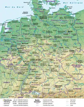 L'Allemagne (en allemand : Deutschland), officiellement la République fédérale d’Allemagne (Bundesrepublik Deutschland) est un État d'Europe centrale, et selon certaines définitions d'Europe de l'Ouest, entouré par la mer du Nord, le Danemark et la mer Baltique au nord, par la Pologne à l'est-nord-est, par la Tchéquie à l'est-sud-est, par l'Autriche au sud-sud-est, par la Suisse au sud-sud-ouest, par la France au sud-ouest, par la Belgique et le Luxembourg à l'ouest, enfin par les Pays-Bas à l'ouest-nord-ouest. Décentralisée et fédérale, l'Allemagne compte quatre métropoles de plus d'un million d'habitants : la capitale Berlin, Hambourg, Munich et Cologne. Le siège du gouvernement est situé dans la ville de Berlin et dans la ville fédérale de Bonn, ancienne capitale de la République Fédérale d'Allemagne. Francfort-sur-le-Main est considérée comme la capitale financière de l'Allemagne[alpha 2] : dans cette ville se trouve le siège de la Banque centrale européenne. La langue officielle du pays est principalement l'allemand, à côté d'autres langues régionales ou minoritaires.