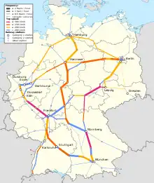 Le , le mur de Berlin, construit en 1961, tombe. L'année suivante, la RDA est absorbée par la RFA. Les Allemands sont de nouveau réunis dans un seul État, la République fédérale d'Allemagne, le . L'Allemagne renonce alors officiellement à ses revendications territoriales sur la Prusse-Orientale[36]. Ce nouvel État doit surmonter le coût de la réunification allemande, c'est-à-dire investir pour rattraper le retard économique des Länder de l'Est par rapport à ceux de l'Ouest. Il s'agit de reconnecter les deux territoires coupés par le rideau de fer durant la Guerre froide : le gouvernement a notamment mis en œuvre des chantiers d'infrastructures de transport : le projet « Unité allemande » lancé en 1992, prévoit des travaux jusqu'en 2010[37] pour un montant total de plusieurs dizaines de milliards d'euros. L'effort est porté en particulier sur les autoroutes à numéros pairs, d'orientation est-ouest : par exemple, la Bundesautobahn 4 qui va de la Rhénanie-du-Nord-Westphalie à la frontière polonaise en passant par la Thuringe. Les canaux sont modernisés ou complétés, comme le Mittellandkanal. L'intégration de l'ex-Allemagne de l'Est à l'Union européenne reste encore inachevée et les inégalités sont toujours présentes.