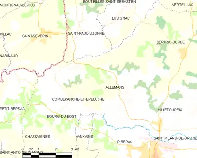 Outre le bourg d'Allemans proprement dit, le territoire se compose d'autres villages ou hameaux, ainsi que de lieux-dits[39] :