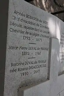 Alphée Bourdon de Vatry, resté sans enfants, meurt le 25 juillet 1871 à l'abbaye de Chaalis, à l'âge de 77 ans. Il est inhumé à Paris au cimetière du Père-Lachaise (division 26) dans la sépulture familiale des Bourdon de Vatry. Son épouse, née Paméla Haingerlot, lui survit dix ans. Elle est inhumée en 1881 à ses côtés.