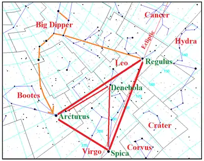 Régulus forme également, avec Arcturus et Spica, l'astérisme du Triangle du printemps. L'étoile peut être repérée en prolongeant l'alignement formé par les étoiles de la Grande Ourse Megrez (δ UMa) et Phecda (γ UMa) en direction du sud[14].