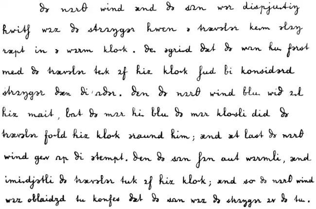 ðə nɔɹθ wind ənd ðə sʌn wɛɹ dis′pjuːtiŋ hwitʃ wəz ðə strɔŋɡəɹ, hwɛn ə travləɹ keːm ə′lɔŋ rapt in ə wɔɹm kloːk. ðeː ə′ɡriːd ðət ðə wʌn huː fəɹst meːd ðə travləɹ teːk ɔf hiz kloːk ʃud bi kon′sidəɹd strɔŋɡəɹ ðən ði ʌðər. ðɛn ðə nɔɹθ wind bluː wiθ ɔːl hiz mait, bʌt ðə mɔːɹ hiː bluː, ðə mɔːɹ kloːsli did ðə travləɹ foːld hiz kloːk ə′raund him; ənd ət last ðə nɔɹθ wind ɡeːv ʌp ði ə′tɛm(p)t. ðɛn ðə sʌn ʃɔn aut wɔːrmli, ənd i′miːdjətli ðə travləɹ tuk ɔf hiz kloːk; ənd soː ðə nɔrθ wind wəz ɔ′blaidʒd to kon′fɛs ðət ðə sʌn wəz ðə strɔŋɡəɹ əv ðə tuː. |