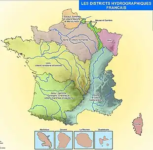 L'Alsace s'étend sur le bassin versant du Rhin[N 4]. La gestion du Rhin (et de la Meuse) relève de l'Agence de l'eau Rhin-Meuse, sise à Metz. Dans le cadre du programme intégré du Rhin[17], la France et l'Allemagne ont aménagé des ouvrages pour écrêter les crues du Rhin. En France, il s'agit du polder d'Erstein (qui intéresse également les communes de Nordhouse et Plobsheim), ainsi que le polder de la Moder, à Fort-Louis. L'Ill constitue la plus grande rivière d'Alsace. À la hauteur du Petit Ried, trois rivières rejoignent le Rhin: