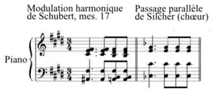 L'art du lied de Schubert a été influencé par l'école souabe d'Allemagne du sud, par l'école de musique de Berlin, ainsi que par certains exemples comme Beethoven (Adelaide, op. 46, À la Bien-aimée lointaine, op. 98) ou aussi par les « Canzonettes anglaises[o 31] » de Haydn ou le lied « La violette[o 32], KV476 » de Mozart. Néanmoins, sa manière d'émanciper l'accompagnement – par des thèmes propres, des formes d'accompagnement et des relations multiples – forment alors une nouveauté complète dans le genre du lied[30].