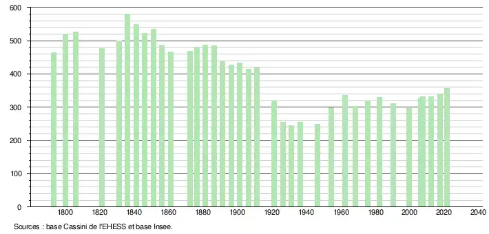 L'évolution du nombre d'habitants est connue à travers les recensements de la population effectués dans la commune depuis 1793. Pour les communes de moins de 10 000 habitants, une enquête de recensement portant sur toute la population est réalisée tous les cinq ans, les populations légales des années intermédiaires étant quant à elles estimées par interpolation ou extrapolation[19]. Pour la commune, le premier recensement exhaustif entrant dans le cadre du nouveau dispositif a été réalisé en 2007[20].