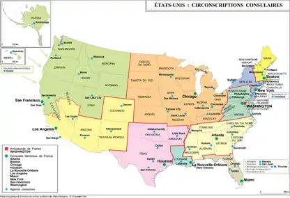 - Consulats Généraux de France à : Washington • Atlanta • Boston • Chicago • Houston • La Nouvelle-Orléans • Los Angeles • Miami • New York • San Francisco.