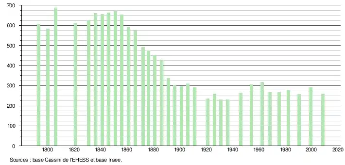 L'évolution du nombre d'habitants est connue à travers les recensements de la population effectués dans la commune depuis 1793. À partir du , les populations légales des communes sont publiées annuellement dans le cadre d'un recensement qui repose désormais sur une collecte d'information annuelle, concernant successivement tous les territoires communaux au cours d'une période de cinq ans. Pour les communes de moins de 10 000 habitants, une enquête de recensement portant sur toute la population est réalisée tous les cinq ans, les populations légales des années intermédiaires étant quant à elles estimées par interpolation ou extrapolation[11]. Pour la commune, le premier recensement exhaustif entrant dans le cadre du nouveau dispositif a été réalisé en 2008[12],[Note 1].