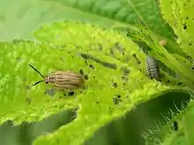 Une Chrysomèle, Ophraella communa, originaire d'Amérique du Nord, retrouvée en Chine (et ensuite utilisé avec succès en lutte biologique dans ce pays) puis en Europe, est spécialisée dans la consommation de l'ambroisie. De grandes surfaces d'ambroisie au nord de l'Italie furent largement réduites par cet insecte au début des années 2000 et O. communa est actuellement considéré comme un moyen de lutte biologique prometteur contre l'ambroisie en Europe[35]. Cependant, l'insecte pourrait également s'alimenter partiellement sur le Tournesol ou autres astéracées, mais deux études de 2014 et 2018 semblent montrer que l'introduction de O. communa n'aurait pas d'impact sur la culture du tournesol[36],[37].