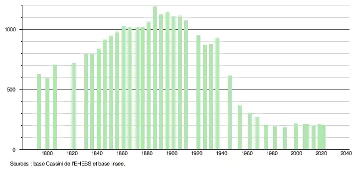L'évolution du nombre d'habitants est connue à travers les recensements de la population effectués dans la commune depuis 1793. Pour les communes de moins de 10 000 habitants, une enquête de recensement portant sur toute la population est réalisée tous les cinq ans, les populations légales des années intermédiaires étant quant à elles estimées par interpolation ou extrapolation[24]. Pour la commune, le premier recensement exhaustif entrant dans le cadre du nouveau dispositif a été réalisé en 2008[25].