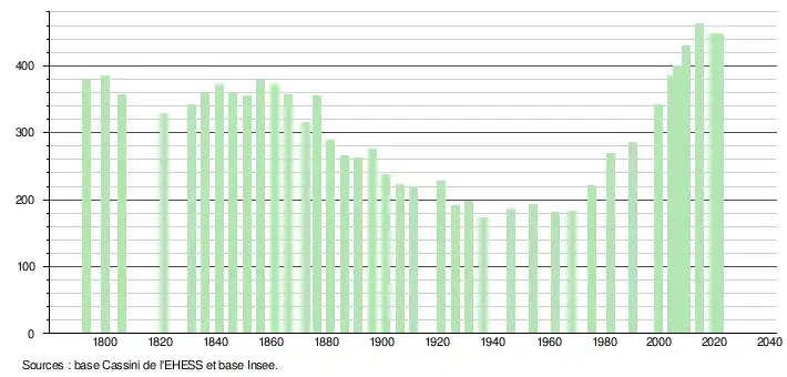 L'évolution du nombre d'habitants est connue à travers les recensements de la population effectués dans la commune depuis 1793. Pour les communes de moins de 10 000 habitants, une enquête de recensement portant sur toute la population est réalisée tous les cinq ans, les populations légales des années intermédiaires étant quant à elles estimées par interpolation ou extrapolation[18]. Pour la commune, le premier recensement exhaustif entrant dans le cadre du nouveau dispositif a été réalisé en 2004[19].