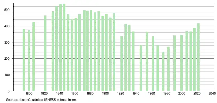 L'évolution du nombre d'habitants est connue à travers les recensements de la population effectués dans la commune depuis 1793. Pour les communes de moins de 10 000 habitants, une enquête de recensement portant sur toute la population est réalisée tous les cinq ans, les populations légales des années intermédiaires étant quant à elles estimées par interpolation ou extrapolation[25]. Pour la commune, le premier recensement exhaustif entrant dans le cadre du nouveau dispositif a été réalisé en 2006[26].