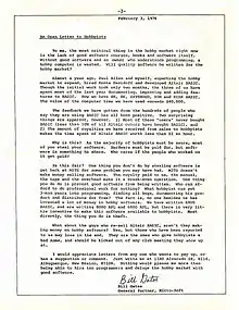 - (en) Bill Gates, « An Open Letter To Hobbyists », Radio-Electronics, New York NY, Gernsback Publications, vol. 47, no 5, , p. 14,16 (lire en ligne)