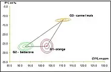 - résultats mesurés par IRMS (la déviation isotopique δ 13C), qui permettent de différencier les plantes en fonction de leur métabolisme photosynthétique (métabolisme C4 comme le maïs opposé au C3 comme la betterave, l’orange ou le raisin) ;