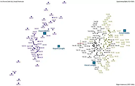 La représentation des données multidimensionnelles dans un espace à dimension réduite est le domaine des analyses factorielles, analyse factorielle des correspondances, analyse en composantes principales, analyse des correspondances multiples[b 23]. Ces méthodes permettent de représenter le nuage de points à analyser dans un plan ou dans un espace à trois dimensions, sans trop de perte d'information, et sans hypothèse statistique préalable[i 27]. En mathématiques, elles exploitent le calcul matriciel et l'analyse des vecteurs et des valeurs propres.
