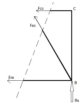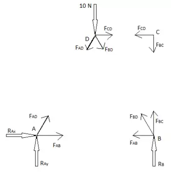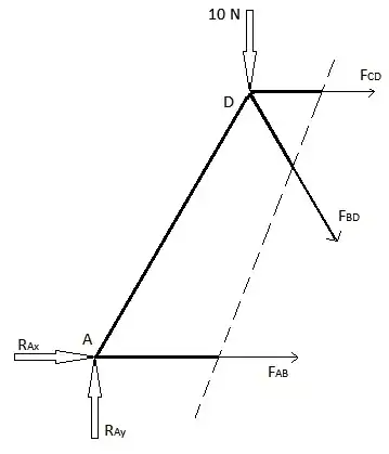 Cette méthode peut être utilisée lorsque les forces des éléments de treillis de quelques éléments seulement doivent être trouvées. Cette méthode est utilisée en introduisant une seule ligne droite traversant l'élément dont la force doit être calculée. Cependant, cette méthode présente une limite dans la mesure où la ligne de coupe ne peut traverser au maximum que 3 éléments de la structure en treillis. Cette restriction est due au fait que cette méthode utilise les équilibres de forces dans les directions x et y ainsi que l'équilibre des moments, ce qui donne un maximum de 3 équations pour trouver un maximum de 3 forces inconnues des éléments de treillis à travers lesquelles cette coupe est réalisée. Trouvez les forces FAB, FBD et FCD dans l'exemple ci-dessus