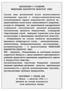 En avril 1991 un groupe d'anarchistes de Homiel Borba en coopération avec la Confédération anarcho-syndicaliste de Moscou (ASC) a organisé une grève sur l'usine typographique Polespechat à Homiel. La première assemblée générale des anarchistes, qui a eu lieu le 1er août 1992 dans une "maison sécurisée" à Minsk, n'a réuni que huit délégués. Lors de cette réunion, une décision fatidique de créer la Fédération des anarchistes de Biélorussie (FAB) a été prise[4].
