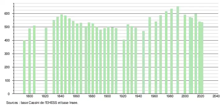 L'évolution du nombre d'habitants est connue à travers les recensements de la population effectués dans la commune depuis 1793. Pour les communes de moins de 10 000 habitants, une enquête de recensement portant sur toute la population est réalisée tous les cinq ans, les populations légales des années intermédiaires étant quant à elles estimées par interpolation ou extrapolation[18]. Pour la commune, le premier recensement exhaustif entrant dans le cadre du nouveau dispositif a été réalisé en 2008[19].