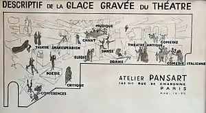 Ce verre églomisé représente les différents arts de la scène. Les figures font référence aux personnages des mythes antiques, selon des conventions classiques, à l'imagerie shakespearienne et italienne. Mais le peintre fait aussi preuve d'inventivité, et situe son œuvre dans l'époque contemporaine par des figures modernes (orchestre symphonique, ballerine, ouvrier sur le décor) et y inclut des représentations moins courantes (les conférences, la critique). Un panneau explicatif permettait d'identifier les scènes.