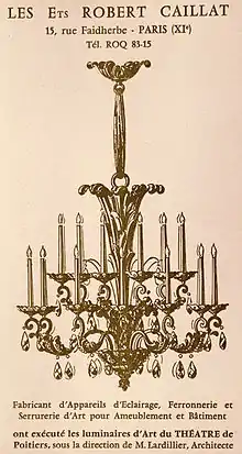 À chaque palier se trouvent des lustres extravagants en laiton et ornés de pampilles créées par la maison Robert Caillat de Paris[12]. D'inspiration baroque, ils rappellent les créations de Gilbert Poillerat et sont très représentatifs du style de la période. Le plus gros, qui présente des fausses bougies et des ampoules cachées dans les volutes des branches, est mis en valeur par l'arrondi du bâtiment. Les grandes fenêtres verticales, qui éclairent les différents niveaux de cet escalier en les traversant, le rendent visible depuis l'extérieur et contribuent à sa mise en valeur. Elles apportent beaucoup de lumière dans le hall, ce qui joue des reflets avec le verre églomisé sur le mur opposé.