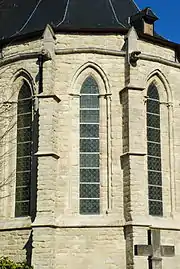 Les murs du chevet, édifiés en moellons, présentent à leur base un soubassement qui fait saillie et est surmonté d'une moulure saillante[3].