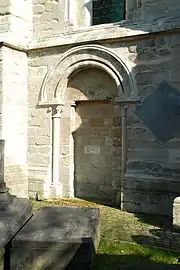 Le mur occidental du chevet (qui est un mur latéral, vu que le chevet est "orienté" au sud) présente une porte (murée) flanquée de fines colonnettes dont les chapiteaux restaurés portent une archivolte en plein-cintre composée d'une voussure torique, d'une voussure plate et d'un larmier.