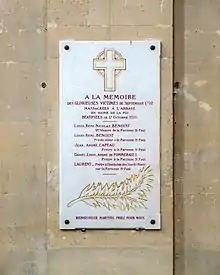 Plaque à la mémoire des prêtres de la paroisse Saint-Paul-des-Champs, victimes des massacres de septembre 1792, fixée sur un pilier de l'église Saint-Paul-Saint-Louis