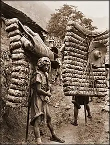 - environ 9 paquets de 17 livres, soit 76 kg d'après Baike. On lit parfois que les porteurs étaient capables de transporter des charges de poids si extravagants que même les champions du monde d'haltérophilie actuels en seraient incapables. Les sherpas portent des charges de 40 kg sur de longues distances et jusqu'à 60 kg sur de plus courtes distances, cf sherpa