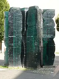 Une autre plaque indique que le mémorial a été érigé par l'Église catholique et l'Église protestante d'Aix-la-Chapelle, comme un avertissement contre toutes les haines et toutes les hostilités.
