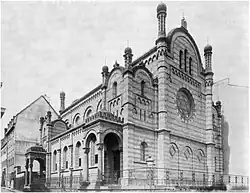 L'architecte… a érigé les arcs en plein cintre des arcades et du chœur de l'orgue dans un style oriental, il a appliqué à l'extérieur une polychromie vive en insérant des bandes de grès brun-rouge dans les surfaces de briques blanches et jaunes, il a donné aux multiples pignons de toit une forme systématiquement semi-circulaire, il a placé des tourelles avec des dômes en forme de minaret aux extrémités de chaque pignon, Il a protégé chacune des deux entrées principales (à gauche pour les hommes, à droite pour les femmes) par un porche similaire à ceux si souvent utilisés dans les mosquées orientales et a cherché enfin à introduire autant que possible dans les ornements romans individuels aussi bien la ligne en zigzag que des formes végétales naturalistes.