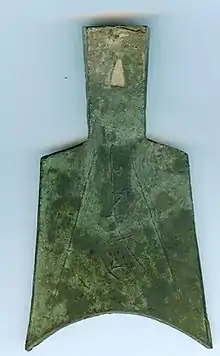 - Monnaies en forme de bêche avec des bords supérieur pointus : c'est un sous-genre des monnaies en forme de bêche avec des pieds carrés, la seule différence entre ces deux types étant la présence de petites formes triangulaires sur les bords supérieurs (voir photo). Les inscriptions présentes sur les trois plus grands modèles de monnaie incluent les caractères jin (chinois : 金) et nie (chinois : 涅). Même si nie était à l'époque le nom d'une rivière dans le Henan, ce caractère ne peut pas pour autant être obligatoirement interprété comme étant l'indication d'un nom de lieu, car il se trouve en conjonction avec d'autres noms de lieux tels que Lu Shi et Yu. Selon le Fang Yan, un livre ancien sur les dialectes, nie signifiait la même chose que hua (chinois : 化), soit "argent" ou "monnaie". Si l'on suit le Fang Yan, les caractères jin nie signifieraient "Pièce en métal". Les poids des pièces les plus grandes semblent légèrement plus élevés que les 14 grammes d'un jin. Les régions où on en trouve correspondent aux États de Liang et de Han[1].