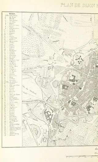 À la fin du XIXe siècle, s'y implantent : l'usine Pétolat[12], l'usine Vernet qui borde le Suzon, la fabrique de moutarde Parizot, l'usine d'Émile Lachèze, la brasserie allemande d'Henry Duthu ou encore la fabrique de chandelles de Louis Sirandré ; et l'entrepôt de vin en gros devient la distillerie Lejay-Lagoutte. Un terrain sera également cédé pour y édifier la « Caisse de crédit municipal » et les cabarets se multiplieront. Le faubourg s’étend avec l'ouverture du boulevard Clemenceau accessible grâce à la nouvelle gare des tramways départementaux et l'ancienne caserne devient la caserne Vaillant[13]. Le lycée royal sera construit sous les plans de l'architecte Arthur Chaudouet.