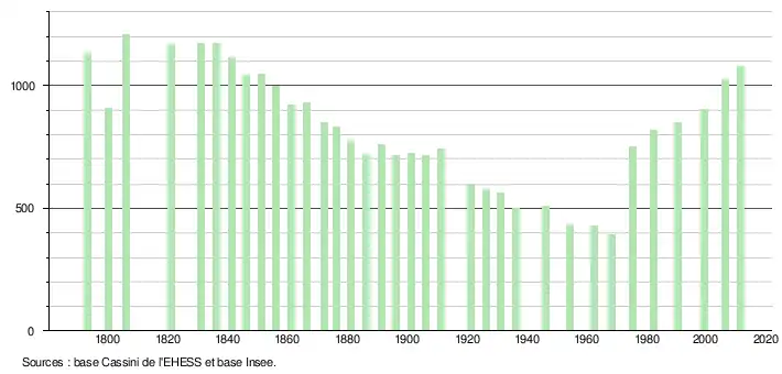 L'évolution du nombre d'habitants est connue à travers les recensements de la population effectués dans la commune depuis 1793. À partir du , les populations légales des communes sont publiées annuellement dans le cadre d'un recensement qui repose désormais sur une collecte d'information annuelle, concernant successivement tous les territoires communaux au cours d'une période de cinq ans. Pour les communes de moins de 10 000 habitants, une enquête de recensement portant sur toute la population est réalisée tous les cinq ans, les populations légales des années intermédiaires étant quant à elles estimées par interpolation ou extrapolation[18]. Pour la commune, le premier recensement exhaustif entrant dans le cadre du nouveau dispositif a été réalisé en 2006[19],[Note 2].