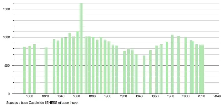 L'évolution du nombre d'habitants est connue à travers les recensements de la population effectués dans la commune depuis 1793. Pour les communes de moins de 10 000 habitants, une enquête de recensement portant sur toute la population est réalisée tous les cinq ans, les populations légales des années intermédiaires étant quant à elles estimées par interpolation ou extrapolation[21]. Pour la commune, le premier recensement exhaustif entrant dans le cadre du nouveau dispositif a été réalisé en 2008[22].