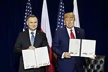 Résolument atlantiste dans la lignée des vues de Droit et justice, il fait de Donald Trump l’un de ses plus fidèles alliés. Il rencontre ainsi le dirigeant américain plus de fois que ne l’ont fait ses prédécesseurs avec les autres présidents américains[36]. Juste avant le premier tour de l’élection présidentielle polonaise de 2020, alors que Duda est le premier président étranger qu'il reçoit depuis la pandémie de Covid-19, Donald Trump vante publiquement l’action de son homologue[37],[38]. Cependant, Duda est un temps, à la mi-2018, persona non grata à la Maison-Blanche après qu’il a signé (tout en la renvoyant devant le Tribunal constitutionnel) la loi mémorielle visant à reconnaître la Pologne comme une nation uniquement victime et non pas complice des crimes commis par l'Allemagne sur son territoire et permettant la condamnation de ceux qui évoquent la complicité de l’État polonais dans le génocide des Juifs pendant la Seconde Guerre mondiale[39],[40].