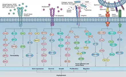 Le facteur de croissance de l’endothélium vasculaire est stimulé pendant l' hypoxie tissulaire et orchestre la formation de vaisseaux sanguins principalement via l'activation du récepteur du facteur de croissance de l’endothélium vasculaire 2 exprimé par les cellules endothéliales[75]. L'activation récepteur du facteur de croissance de l’endothélium vasculaire 2 initie plusieurs voies de signalisation conduisant à des réponses endothéliales spécifiques telles que la survie cellulaire, la prolifération, la migration, l'invasion, la perméabilité vasculaire et l'inflammation vasculaire[76]. Une coordination étroite de ces processus cellulaires est cruciale pour l’établissement réussi de nouveaux vaisseaux. Au cours de l'angiogenèse tumorale, le facteur de croissance de l’endothélium vasculaire sécrété par les cellules tumorales induit la prolifération et la survie des cellules endothéliales principalement via la voie de signalisation ERK[77] et la voie de signalisation PI3K/AKT[78]. La migration des cellules endothéliales en aval du facteur de croissance de l’endothélium vasculaire 2 est implique souvent la stimulation de la phosphoinositide 3-kinase et l'activation des Rho GTPases[79]. L'invasion cellulaire médiée par le facteur de croissance de l’endothélium vasculaire est favorisée par l'expression de métalloprotéinase matricielle (MMP-2, MMP-9) et l'activateur de l'urokinase qui dégradent la membrane basale vasculaire et la matrice extracellulaire permettant la migration de cellules endothéliales et la formation de pousses capillaires[78],[80].