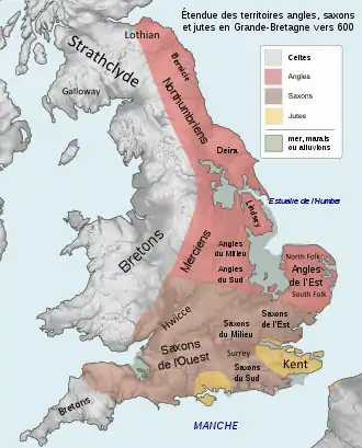 Selon Bède le Vénérable, les Angles vinrent avec des contingents de Jutes et de Saxons pour répondre à l'appel du roi breton Vortigern en 449[1] : les territoires sur lesquels régnait ce dernier étaient menacés par les Scots, des envahisseurs venus d'Irlande[2]. Au contraire, selon l'historien byzantin Procope, les premiers Angles étaient surtout accompagnés de Frisons. La présence de ces derniers est effectivement attestée par l’archéologie.