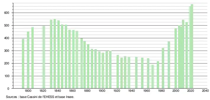 L'évolution du nombre d'habitants est connue à travers les recensements de la population effectués dans la commune depuis 1793. Pour les communes de moins de 10 000 habitants, une enquête de recensement portant sur toute la population est réalisée tous les cinq ans, les populations légales des années intermédiaires étant quant à elles estimées par interpolation ou extrapolation[19]. Pour la commune, le premier recensement exhaustif entrant dans le cadre du nouveau dispositif a été réalisé en 2004[20].