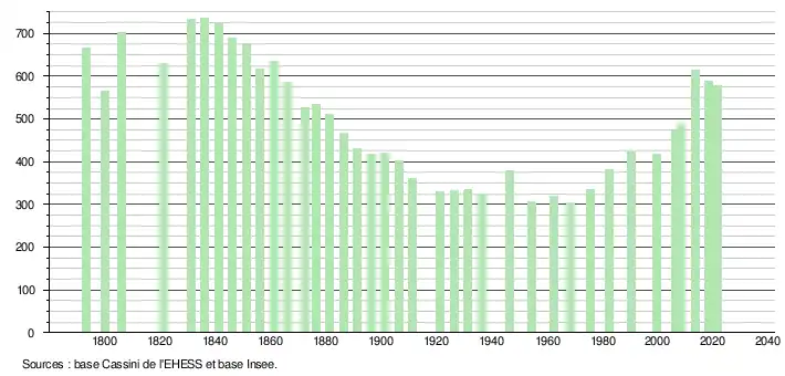 L'évolution du nombre d'habitants est connue à travers les recensements de la population effectués dans la commune depuis 1793. Pour les communes de moins de 10 000 habitants, une enquête de recensement portant sur toute la population est réalisée tous les cinq ans, les populations légales des années intermédiaires étant quant à elles estimées par interpolation ou extrapolation[23]. Pour la commune, le premier recensement exhaustif entrant dans le cadre du nouveau dispositif a été réalisé en 2008[24].
