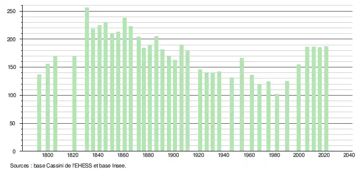 L'évolution du nombre d'habitants est connue à travers les recensements de la population effectués dans la commune depuis 1793. Pour les communes de moins de 10 000 habitants, une enquête de recensement portant sur toute la population est réalisée tous les cinq ans, les populations légales des années intermédiaires étant quant à elles estimées par interpolation ou extrapolation[19]. Pour la commune, le premier recensement exhaustif entrant dans le cadre du nouveau dispositif a été réalisé en 2006[20].