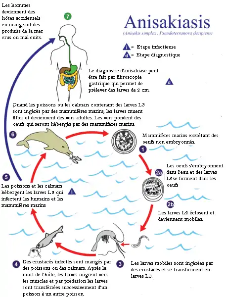 Anisakis spp. a un cycle de vie complexe qui le fait passer par un certain nombre d’hôtes au cours de sa vie. Les œufs éclosent dans l'eau de mer et les larves sont mangées par des crustacés pélagiques, généralement des Euphausiidae qui constituent le premier hôte intermédiaire. Le crustacé infecté est mangé à son tour par un deuxième hôte intermédiaire, poisson ou céphalopode, tels le calmar ou la seiche. Le nématode creuse dans la paroi de l’intestin et s’enkyste à l’intérieur d’une enveloppe protectrice, d'habitude sur la face extérieure des organes viscéraux, mais de temps en temps dans le muscle ou sous la peau. Le cycle parasitaire s’achève quand un poisson infecté est mangé par son hôte définitif qui est un mammifère marin, soit un cétacé comme une baleine ou un dauphin soit un pinnipède comme le phoque, ou encore un oiseau de mer. Le nématode s’exkyste dans l'intestin (c'est-à-dire sort de son kyste), se nourrit, grandit, s’accouple, et les œufs sortent dans l'eau de mer dans les fèces de l’hôte. Comme le tube digestif d'un mammifère marin est fonctionnellement très semblable à celui d'un être humain, Anisakis spp. est capable d'infecter les personnes qui mangent le poisson cru ou insuffisamment cuit, provoquant l'anisakiase. Grâce à l'apparition des techniques génétiques modernes dans l'identification et la classification scientifique des espèces au cours des vingt dernières années, le genre s’est révélé présenter une grande biodiversité[2]. On a découvert que chaque espèce d'hôte final abrite sa propre espèce d’Anisakis spp., biochimiquement et génétiquement identifiable, à reproduction endogame. Plusieurs espèces d’Anisakis morphologiquement semblables peuvent ainsi constituer un complexe d'espèces cryptiques. Cette découverte a permis d’utiliser la proportion d'espèces cryptiques différentes dans un poisson comme indicateur de l'identité d’une population dans les stocks de poisson.