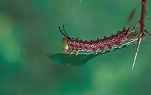 La chenille mesure à maturité environ 5 cm. Elle est rayée de bandes longitudinales de couleur gris-brun et rouge, agrémentées de points noirs et de petites taches blanches. Elle porte de courtes épines noires surtout présentes sur le dos et deux cornes noires d’environ 5 mm de long derrière la tête[1].