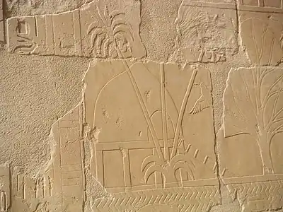 Relief représentant l'arrivée de l'expédition égyptienne au pays de Pount - Détail d'une des maisons du village ; à gauche on remarque dans la colonne de hiéroglyphes les deux premiers signes formant le nom du pays Pount - Temple d'Hatchepsout à Deir el-Bahari
