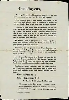 Au cours du mois d' débute la mission du sénateur français Armand Laity (4 au ) en vue de la préparation du plébiscite[25], par exemple, des émissaires français parcourent le Chablais et le Faucigny afin de sonder les populations. Parallèlement, on diffuse les avantages de l'entrée dans l'Empire comme la diminution de la durée du service militaire, la suppression des douanes avec la France et l'entrée de denrées à bas prix, un afflux de capitaux, une meilleure répartition des impôts et surtout un pays avec lequel les Savoyards partagent la même langue. À partir du , des troupes françaises arrivent à Chambéry[Note 8].