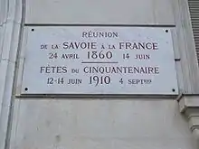 Les principales villes de Savoie possèdent une « rue de l'Annexion ». Toutefois, l'expression est beaucoup plus présente dans le nord de la Savoie[Note 2] que dans le sud, où Chambéry, ex-capitale du duché, l'a fait renommer avenue du Général-de-Gaulle[7].