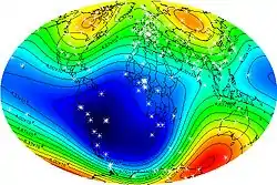 Champ magnétique total de la Terre. L'AMAS est représentée par la partie bleue et sombre au-dessus du Brésil. Les lignes de champ ayant en ce point à peu près la forme d'une tête de canard, la zone est aussi connue, dans les pays de langue espagnole, sous le nom de El Pato.