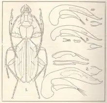 Ses élytres ne sont pas tout à fait deux fois plus longues que larges et atteignent une largeur d'environ 1,5 fois celle du prothorax. Elles sont peu bombées et légèrement aplaties le long de la ligne alaire. Le métathorax est très fortement biseauté et échancré. Le bord latéral est rectiligne jusqu'au milieu de l'élytre, puis régulièrement arrondi jusqu'à l'extrémité. La ponctuation est faible[1].