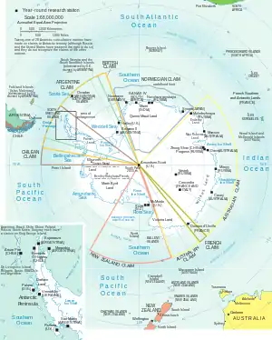 L'Année polaire internationale (API) (1882-1883) et l'Année géophysique internationale (AGI) (1957-1958) vont soulever un certain nombre de questionnements politiques et économiques sur l'avenir de l'Antarctique. Ainsi va naître le traité sur l'Antarctique qui donne à ce continent son statut unique destiné à la science, aux actions pacifiques, à la préservation des ressources naturelles et à la protection de la biodiversité. Signé le à Washington par douze pays soit l'Afrique du Sud, l'Argentine, l'Australie, la Belgique, le Chili, les États-Unis, la France, le Japon, la Norvège, la Nouvelle-Zélande, le Royaume-Uni et l'URSS (actuelle Russie), le traité compte en 2019 cinquante-quatre États signataires[36]. La Convention sur la conservation de la faune et la flore marines de l'Antarctique[37] en 1982, le protocole de Madrid en 1991 et des programmes de recherche internationaux comme le recensement de la vie marine de l'océan Austral (2003-2010) ou bien l'Antarctic Research, a European Network for Astrophysics (ARENA) illustrent la volonté des États de poursuivre les objectifs établis en 1959.