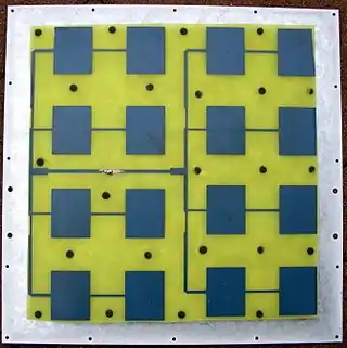 Une antenne à éléments rayonnants imprimés, communément appelée antenne patch (en anglais) ou antenne planaire, est une ligne microruban de forme particulière. Elle se compose d’un plan de masse et d’un substrat diélectrique dont la surface porte un ou plusieurs éléments métalliques.